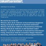 Wir möchten mit den Menschen ins Gespräch kommen, die unsere Gemeinde jeden Tag prägen. Deshalb laden wir in den kommenden Wochen zu einer Reihe offener Bürgergespräche in allen Ortsteilen ein.